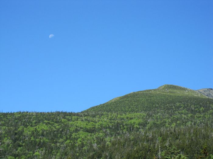Was able to get some shots of the half-moon over the Presidentials - very nice! I reached the outlook known as Harvard Rock. It provides a great view into Tuckerman Ravine. Some more photos and I was on my way. As I left the treeline behind and headed out into the open I thought maybe the bugs would be left behind - no such luck. As long as I kept moving there was no problem but a momentary pause soon found me covered with flying, biting insects. So I kept moving.