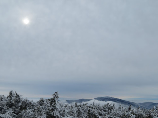 As I made my way along the Kinsman Ridge Trail I could see that the cloud cover was dropping and it soon turned into an undercast. When I reached the summit of South Kinsman I momentarily had it to myself. While there was a high thin overcast above there was an undercast below. It was cold and windy here so I didn't stay long and soon started my return trip.