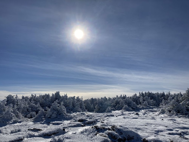 There was a thick coating of snow on the trees as I made my way up the Webster Cliff Trail to the summit. It was a beautiful day up there with blue sky, sunshine and no wind. I lingered on the summit and just below it enjoying the views and sunshine. I then began my descent. I managed to get back down without any slips or falls by carefully negotiating the ice along the way.