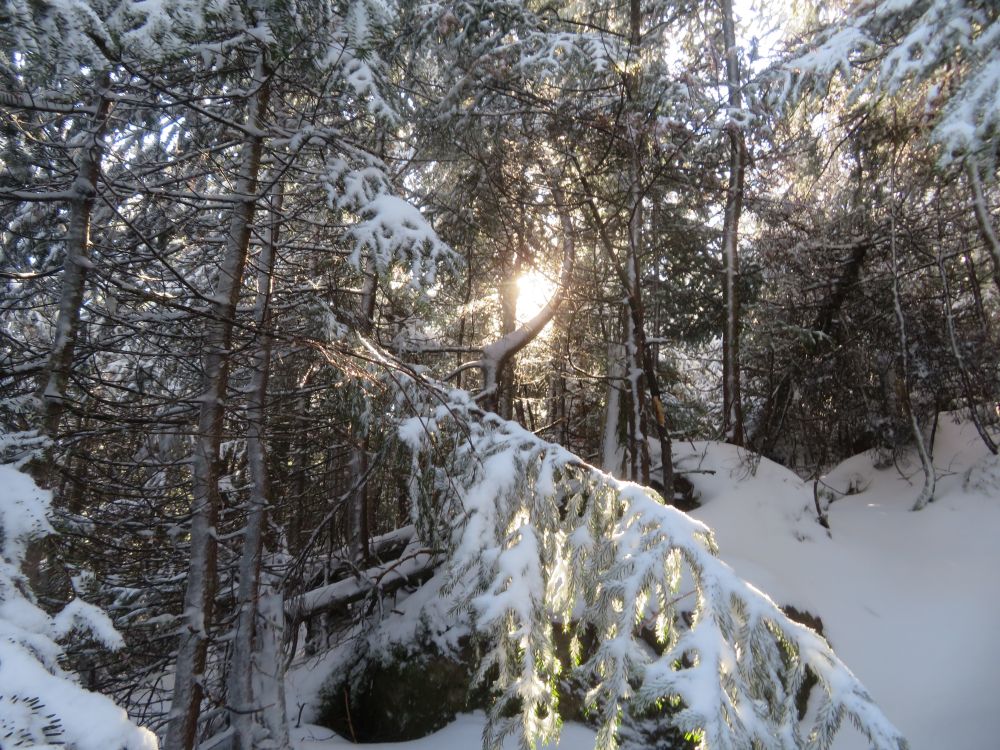 When we got back onto the trail the steady climb up began. The depth of snow increased slightly but never more than about six inches and it hung heavy on the trees. After the relentless ascent we stopped briefly at the North Twin outlook and enjoyed the spectacular views. We then headed over to South Twin.