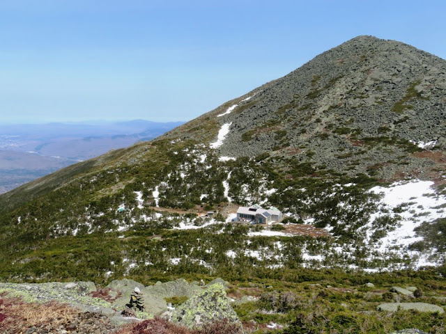 We arrived at Madison Hut and decided to hike Mount Madison first. We dropped our packs at the hut and kept the microspikes on for about 50 yards until there was no more snow or ice. We stashed the spikes under a rock and bare booted to the summit. There was a breeze blowing but it was quite tolerable. A few photos and we were on our way back down to the hut. We stopped and got our microspikes and carried them down. While we were taking a short break a helicopter flew up and dropped off a load of scaffolding not far from the hut.